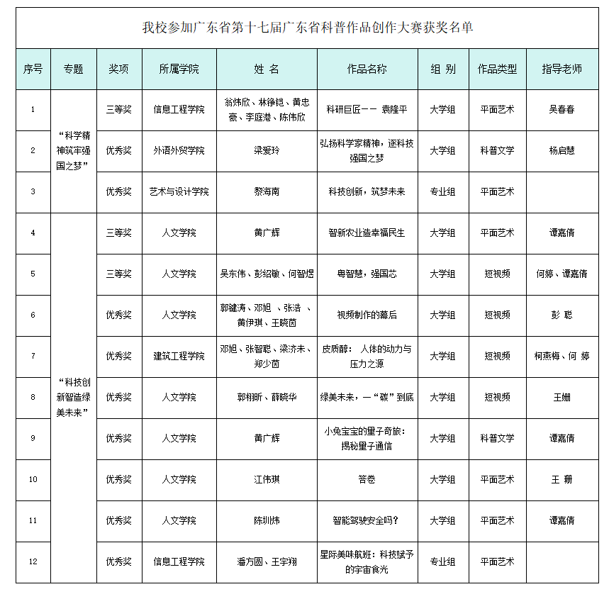 其中,在“科学精神筑牢强国之梦”专题中,获1项三等奖、2项优秀奖;“科技创新智造绿美未来”专题中,获2项三等奖、7项优秀奖。